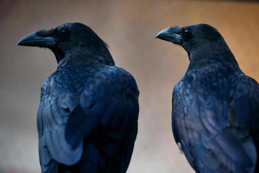 Dois dos seis corvos que vivem na Torre de Londres: segundo a lenda,para que o reino da Inglaterra não se acabe,é preciso que haja ao menos uma dessas aves na antiga fortaleza — Foto: Benjamin Cremel / AFP
