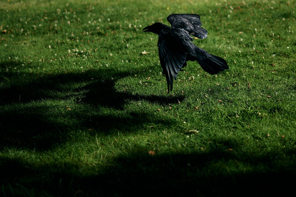 Um dos seis corvos que vivem na Torre de Londres,às margens do Rio Tâmisa,na capital do Reino Unido — Foto: Benjamin Cremel / AFP