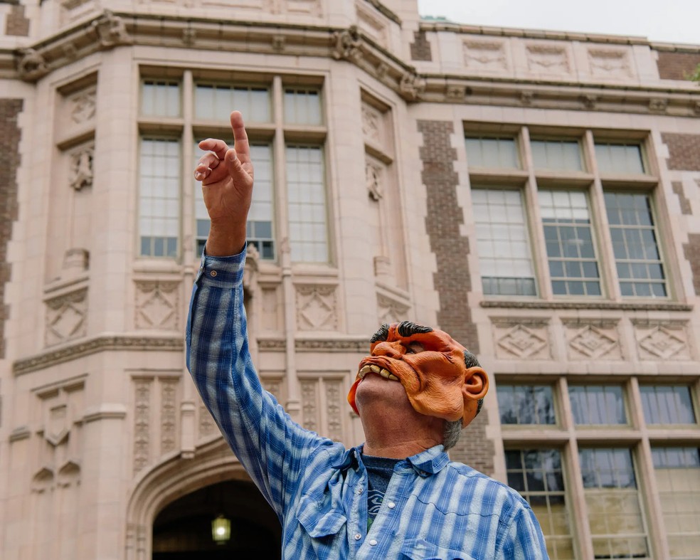 Numa manhã cinzenta de domingo,no mês passado,um homem usando uma máscara de ogro caminhou pelo campus da Universidade de Washington,em Seattle. Ele passou por estudantes e seus pais,que pausaram sua visita guiada ao local para observar o personagem que parecia saído de um filme de Halloween de baixo orçamento.