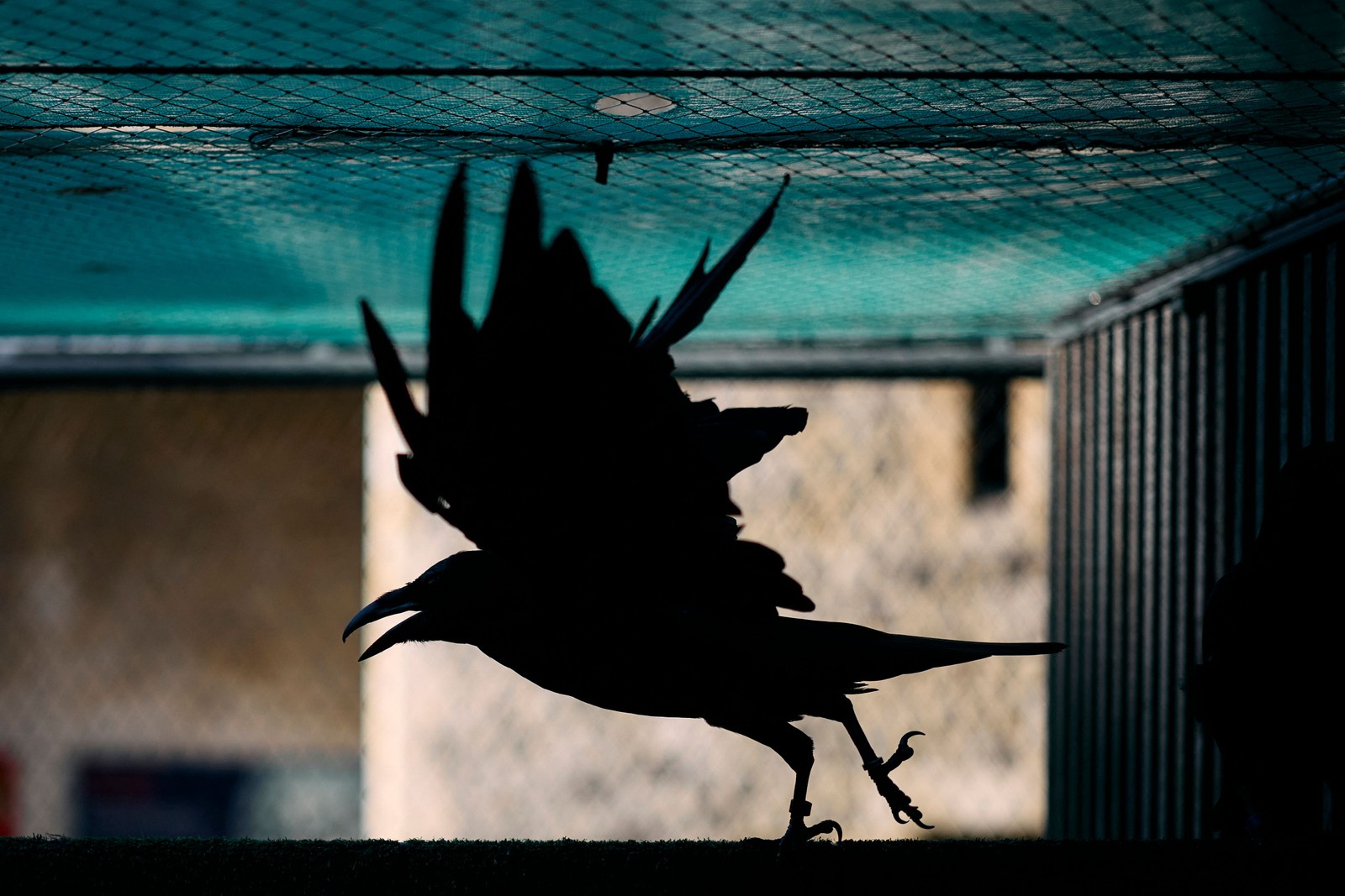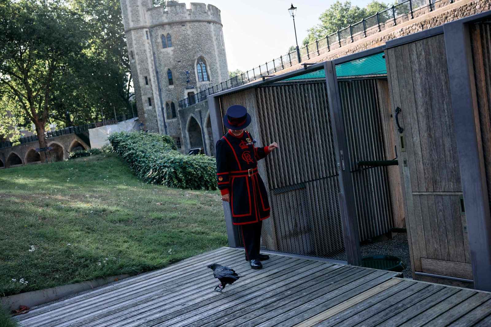 Barney Chandler,o novo 'mestre dos corvos' da Torre de Londres,solta uma das aves do recinto onde elas passam a noite — Foto: Benjamin Cremel / AFP