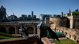 Um dos corvos da Torre de Londres: segundo a lenda,surgida no reinado de Charles II,no século XVII,enquanto houver uma dessas aves na antiga fortaleza,o reino da Inglaterra se manteria de pé — Foto: Benjamin Cremel / AFP
