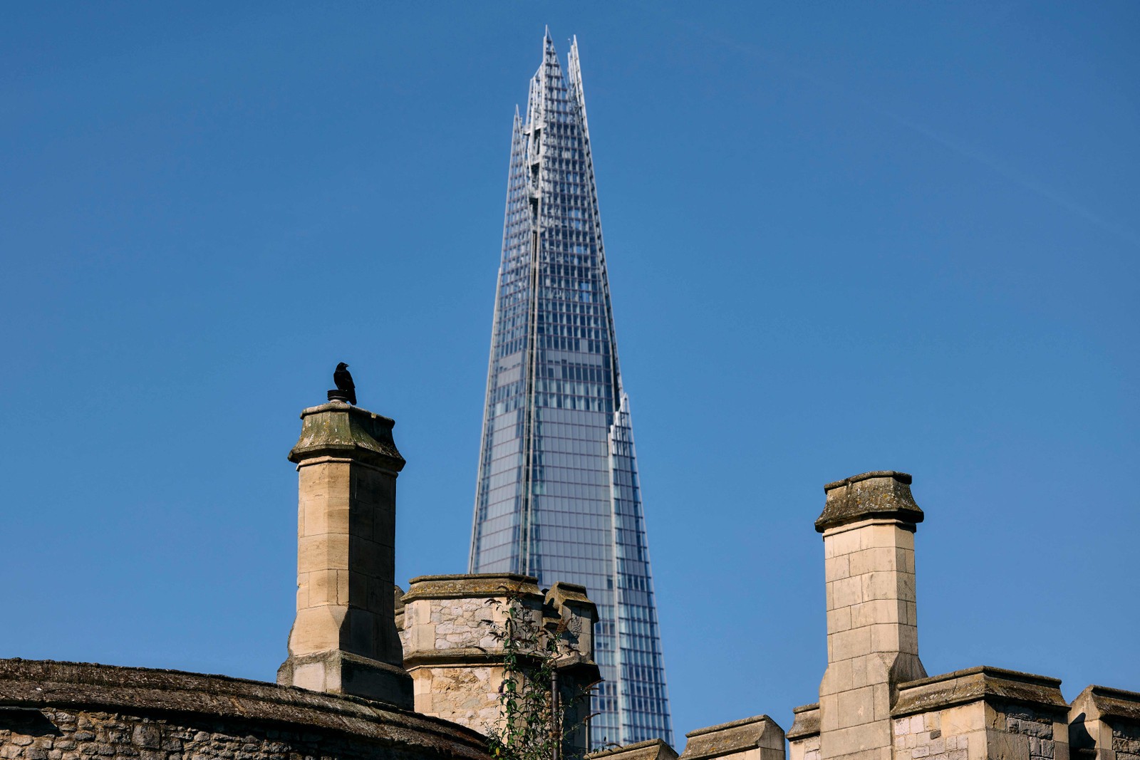 O contraste entre as chaminés da Torre de Londres e o arranha-céu The Shard,que tem 309 metros de altura e é o mais alto edifício do Reino Unido — Foto: Benjamin Cremel / AFP