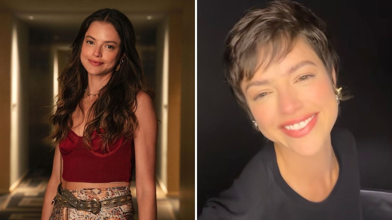 Agatha Moreira também transformou o cabelo para a segunda fase de Luma em "Mania de você". A vilã terá o cabelo curtinho após a passagem de tempo — Foto: Divulgação/TV Globo e Reprodução/Instagram