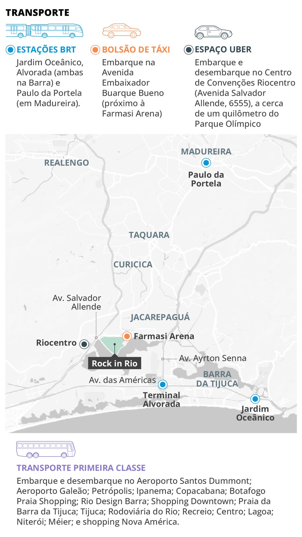 O BRT é a aposta da prefeitura para o transporte até o festival. O modal recebe o Expresso Rock in Rio,com três linhas saindo das estações Jardim Oceânico (Barra),Terminal Alvorada (Barra) e Paulo da Portela (Madureira). As duas primeiras serão diretas,e a última terá paradas na Praça Seca,no Tanque e na Taquara. O funcionamento será das 11h às 5h,com desembarque na Estação Terminal Centro Olímpico,onde os passageiros receberão uma pulseira,a fim de que possam pegar os ônibus para retornar. O valor,de ida e volta,é de R$ 23.