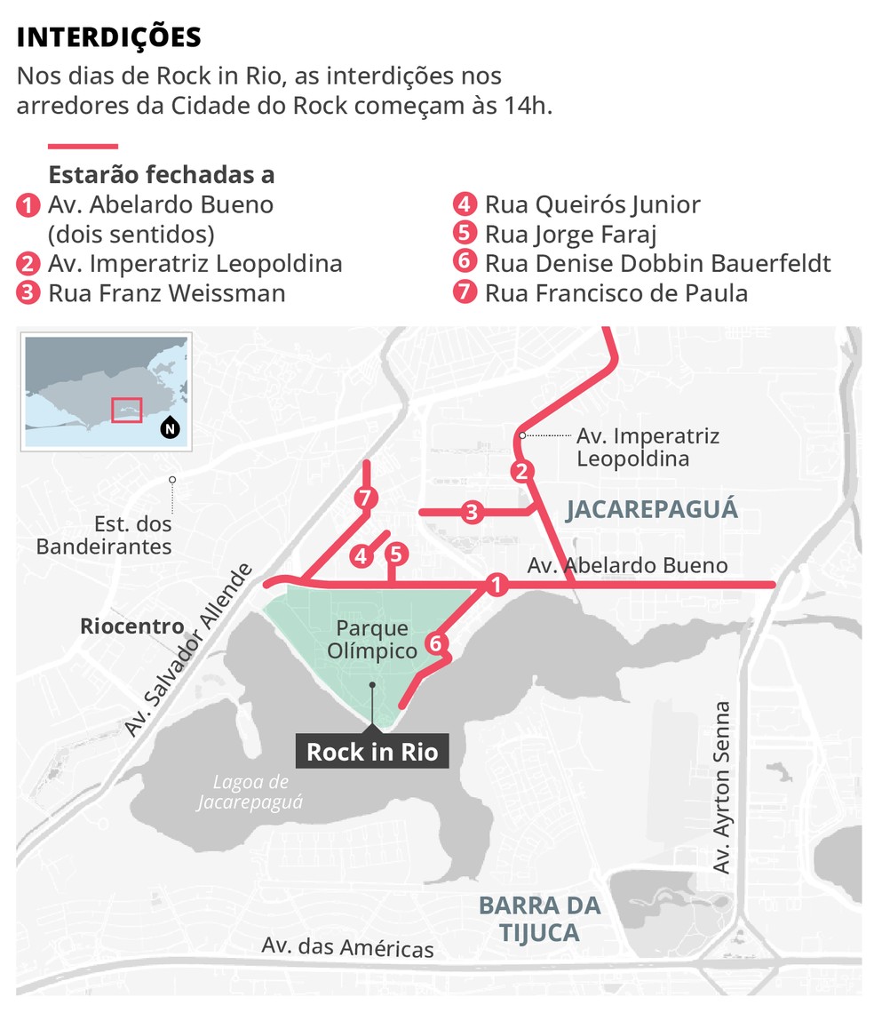 Pouco importa de onde você vai sair,seja do próprio Rio ou de cidades e estados vizinhos,todos os caminhos levam à Cidade do Rock,na Barra da Tijuca,onde são esperadas 700 mil pessoas,nos sete dias da décima edição daquele que é considerado um dos mais famosos e esperados festivais de música do mundo. A prioridade deve ser usar o transporte público,enfatiza a prefeitura,lembrando que foi montado um esquema de interdições e proibição de estacionamento no entorno do Parque Olímpico,para garantir a realização do Rock in Rio 2024,que começa hoje. E não faltam opções para o deslocamento por coletivos,para chegar ao espaço e sair de lá.