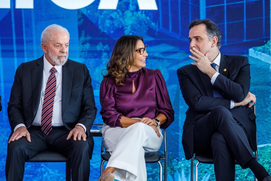 O presidente Lula,a primeira-dama Janja,e o presidente do Senado,Rodrigo Pacheco (PSD-MG) — Foto: Brenno Carvalho/Agência O Globo