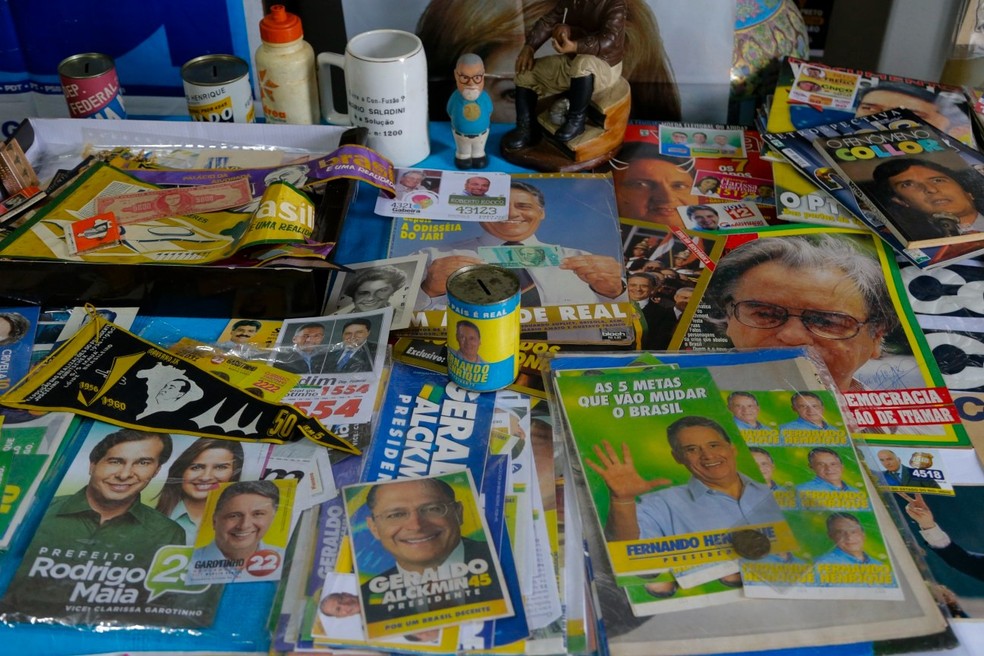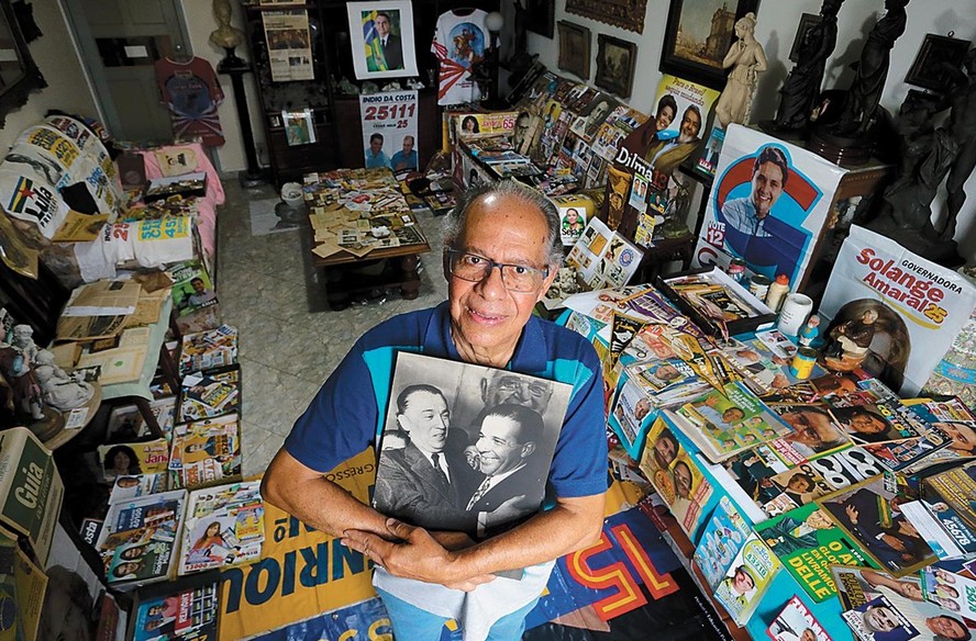 Fernando França Leite e seu museu particular de santinhos e suvenires das eleições,na casa onde mora em Piedade,no subúrbio carioca — Foto: Domingos Peixoto/Agência O Globo