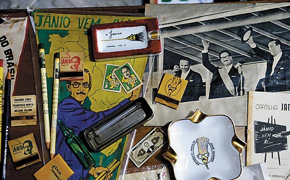 A vassourinha do ex-presidente Jânio Quadros,que prometia varrer a corrupção,é vista nos mais diferentes exemplares. Em um repartimento de metal,típico de antigos kits de primeiros socorros,um frasco de penicilina carrega a miniatura da vassoura mergulhada e uma injeção. Isso era distribuído aos eleitores,além de cinzeiros,lápis e selos de cartas.