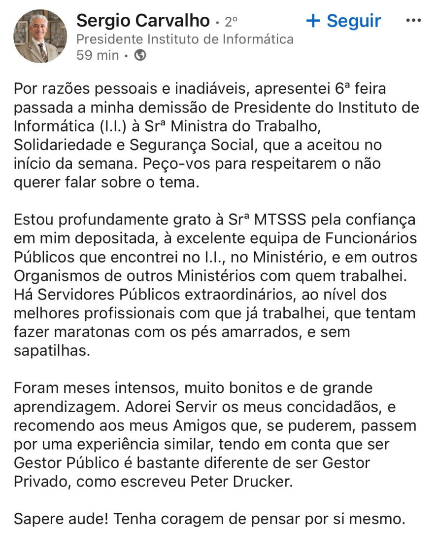 "Por razões pessoais e inadiáveis,apresentei na sexta-feira passada a minha demissão de Presidente do Instituto de Informática (I.I.) à Srª Ministra do Trabalho,que a aceitou no início da semana. Peço-vos para respeitarem o não querer falar sobre o tema",escreveu na sua página na rede social Linkedin.